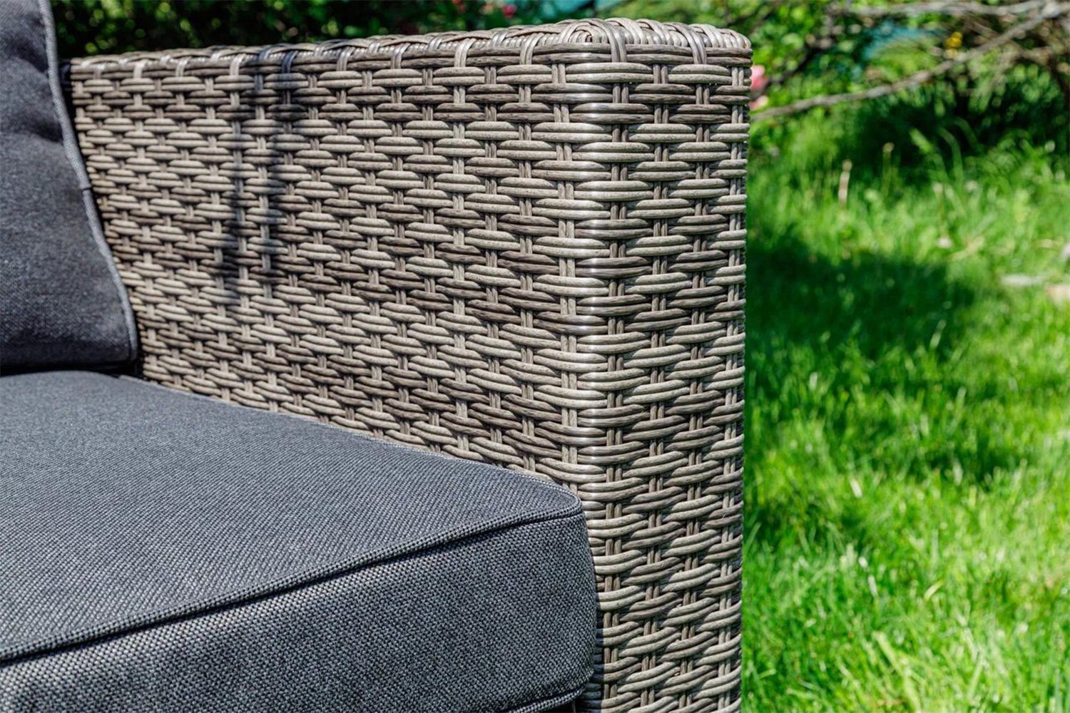 Набор уличной мебели – отличный вариант для обустройства места отдыха на природе. Набор мебели Карл состоит из трехместного дивана, двух кресел и обеденного стола. Спинки кресел и дивана – низкие, при этом очень красиво выглядят в плане общего дизайна. Оплетка всей мебели из искусственного ротанга серого цвета вовсе не скучна, и не привлекает лишнее внимание.